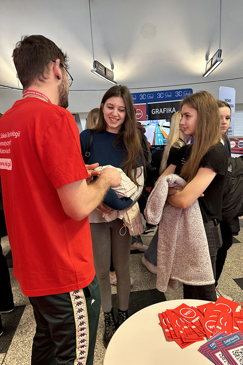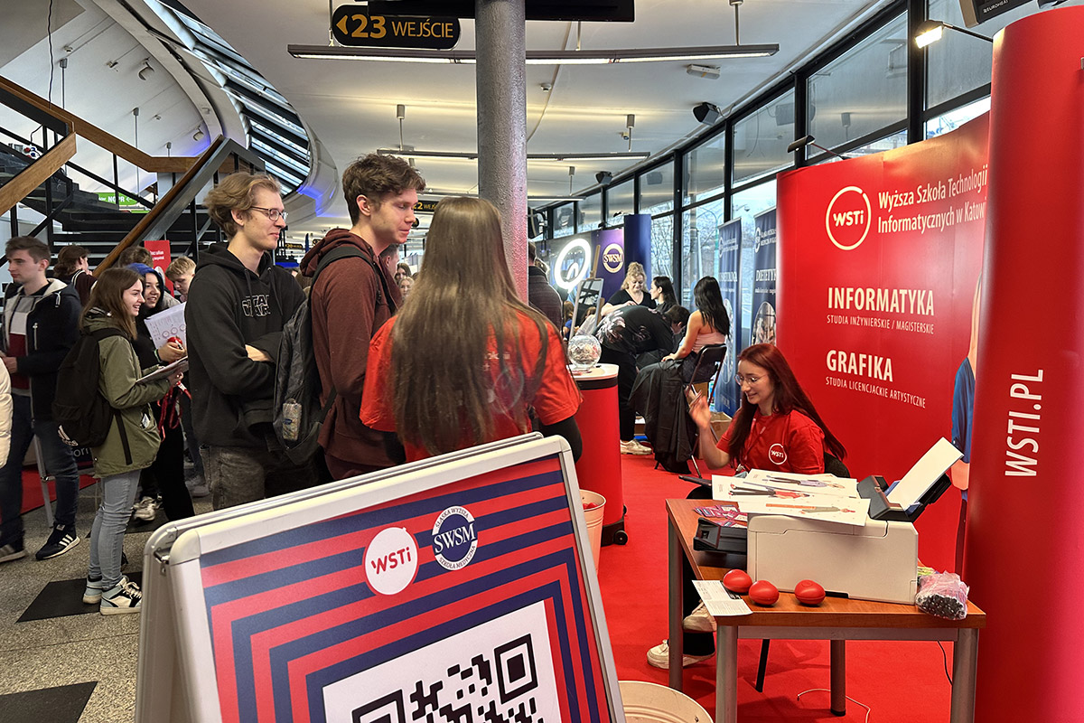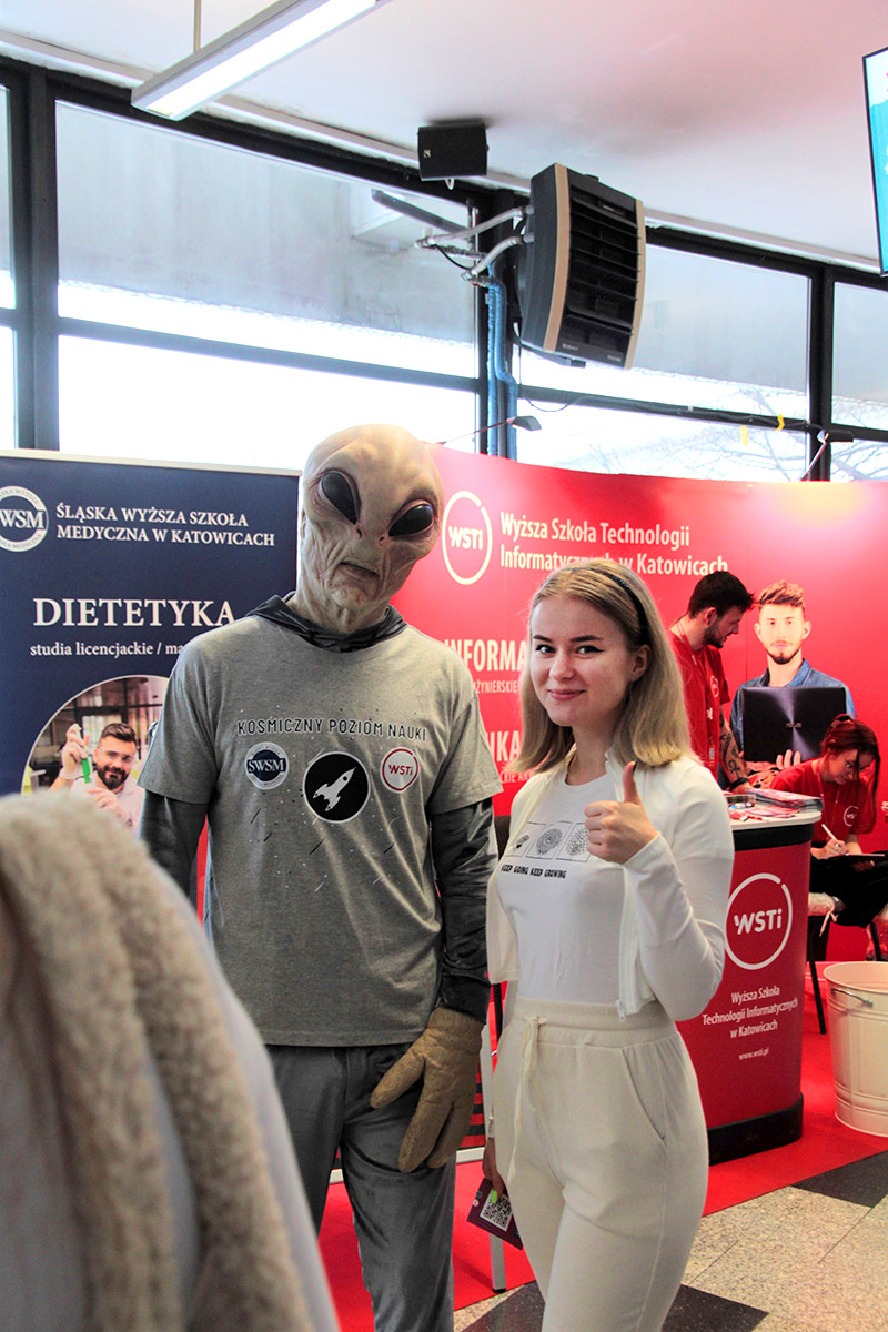Jak co roku z przyjemnością spotkaliśmy się z Wami na targach edukacyjnych w Spodku. 22 i 23. 03 na naszym stanowisku czekało na Was wiele atrakcji — m.in. platforma VR, personalizowane portrety, spotkanie z pozaziemskim gościem, a przede wszystkim merytoryczne odpowiedzi na pytania o uczelnię.