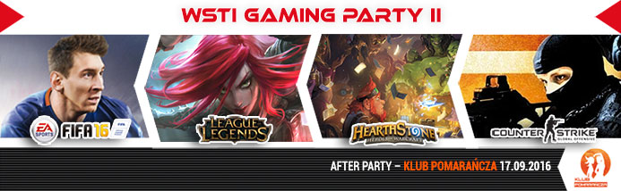 Samorząd Studencki Wyższej Szkoły Technologii Informatycznych w Katowicach serdecznie zaprasza na drugą edycję WSTI Gaming Party 16 i 17 września 2016 r. w siedzibie Wyższej Szkoły Technologii Informatycznych w Katowicach. League of Legends 5vs5, FIFA 16 1vs1, Hearthstone 1vs1, Counter Strike Global Offensive 5vs5, gry planszowe i konkurs Cosplay.