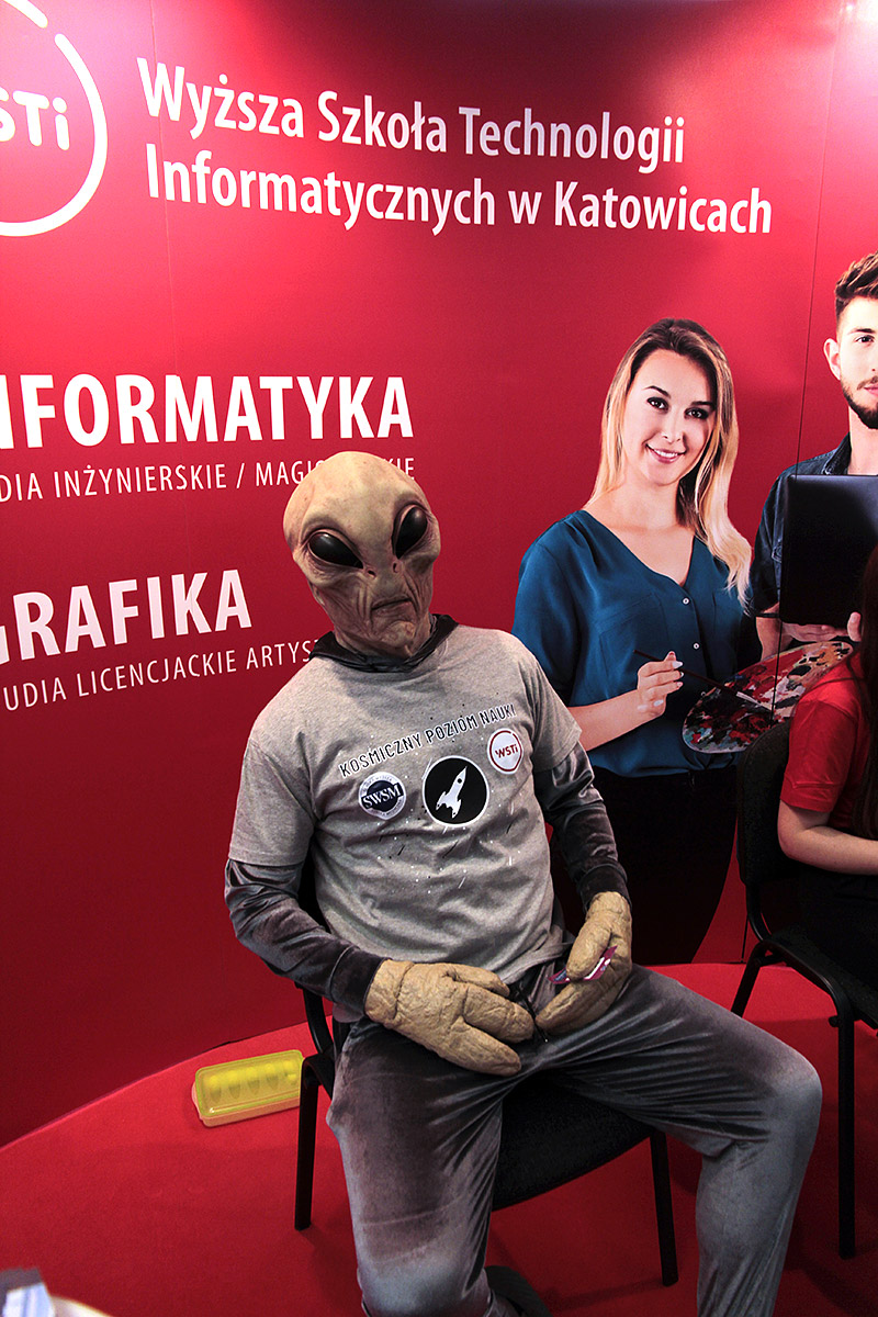 Jak co roku z przyjemnością spotkaliśmy się z Wami na targach edukacyjnych w Spodku. 22 i 23. 03 na naszym stanowisku czekało na Was wiele atrakcji — m.in. platforma VR, personalizowane portrety, spotkanie z pozaziemskim gościem, a przede wszystkim merytoryczne odpowiedzi na pytania o uczelnię.